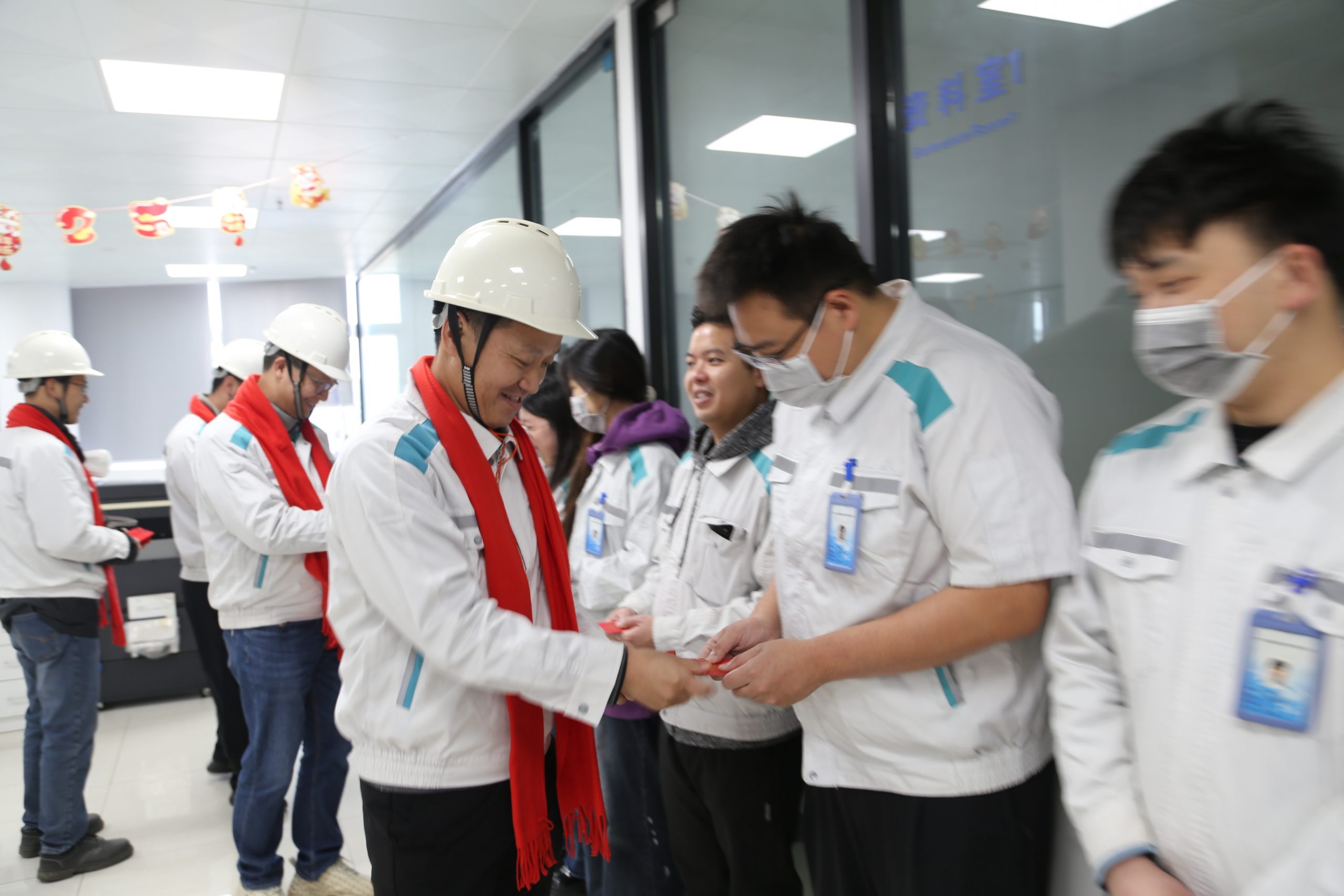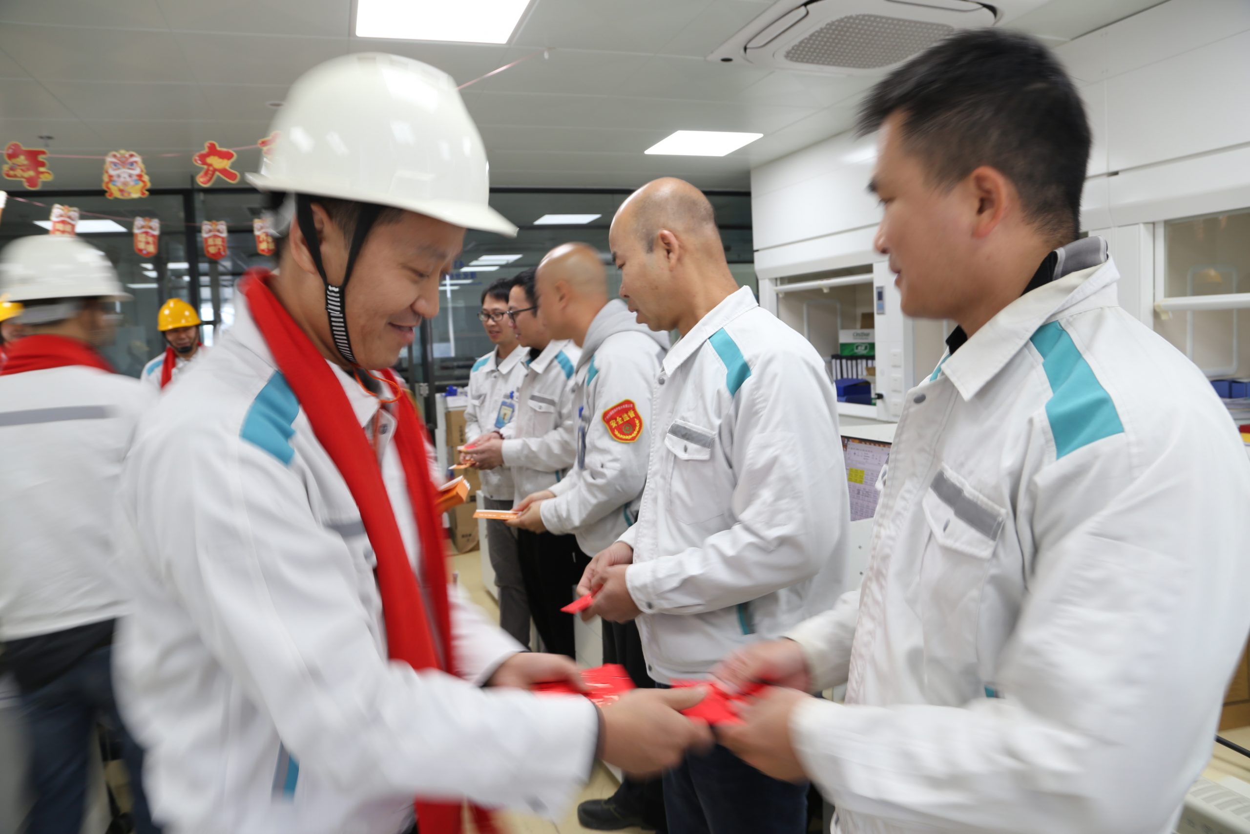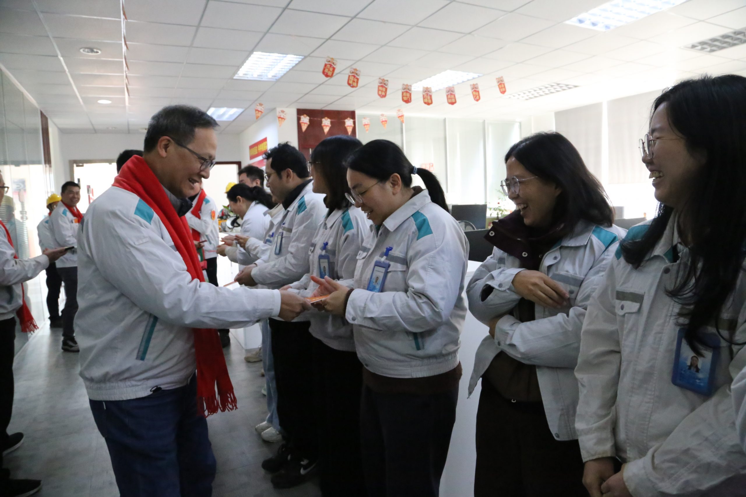啟封利是,萬(wàn)事順?biāo)臁?/b>歡迎儀式結(jié)束后,公司班子成員、中層管理人員前往各部門(mén),將開(kāi)工紅包與新年祝福帶給每一位職工,各部門(mén)員工紛紛表態(tài),新的一年將砥礪前行、乘風(fēng)破浪、奮勇?tīng)?zhēng)先。
