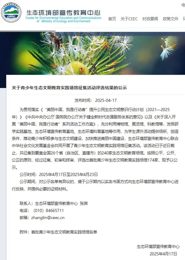 近日,由生態(tài)環(huán)境部宣傳教育中心聯(lián)合中華社會(huì)文化發(fā)展基金會(huì)共同開(kāi)展了青少年生態(tài)文明教育實(shí)踐場(chǎng)館征集活動(dòng),廣州市環(huán)境保護(hù)技術(shù)有限公司在全國(guó)26個(gè)省(自治區(qū)、直轄市)的240家生態(tài)文明教育場(chǎng)館中脫穎而出,被評(píng)選為“首批青少年生態(tài)文明教育實(shí)踐場(chǎng)館”。