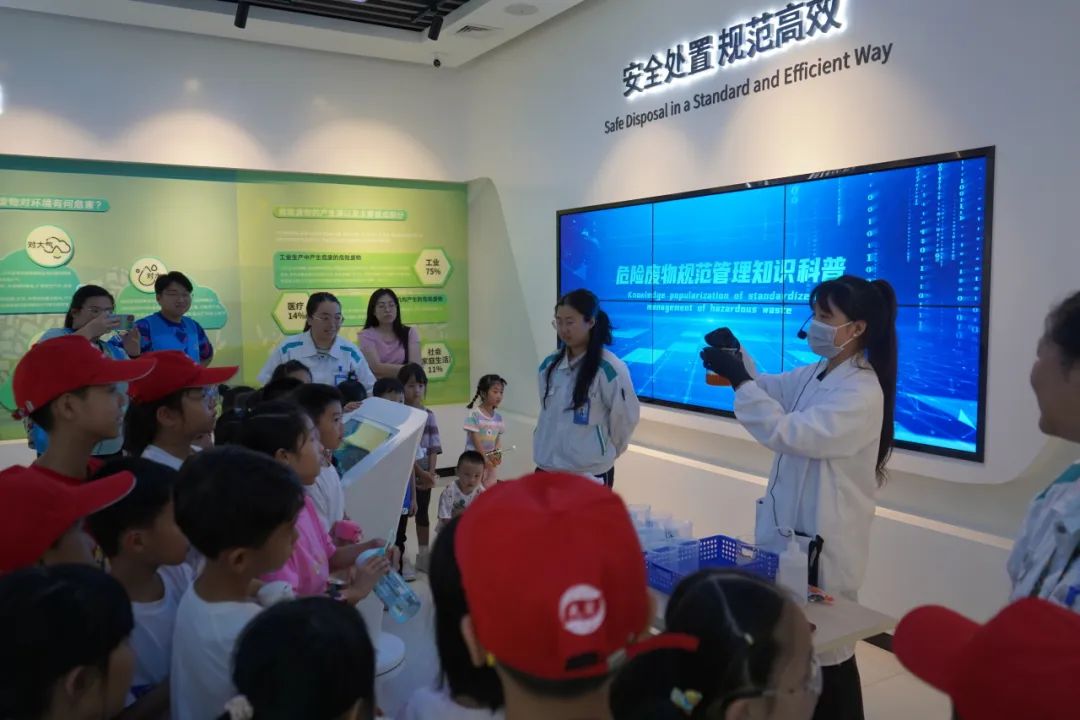 陣地建設(shè)以來(lái),環(huán)保技術(shù)公司開(kāi)展多樣科普宣教和產(chǎn)學(xué)研活動(dòng),每年接待公眾近1000人次,主要包含企事業(yè)單位、學(xué)校、政府部門(mén)等主體單位,講好綠色故事,積極擴(kuò)大環(huán)境宣傳教育的輻射面和影響力。在青少年參觀接待過(guò)程中,或介紹危廢處置技術(shù)工藝,或設(shè)置多種實(shí)驗(yàn)與游戲互動(dòng),如開(kāi)展還原反應(yīng)、酸堿反應(yīng)等小實(shí)驗(yàn),讓學(xué)生從實(shí)驗(yàn)中觀察物質(zhì)的反應(yīng)變化,了解物化處理,并設(shè)置研學(xué)科普課堂,開(kāi)設(shè)凈水實(shí)驗(yàn)、制作太陽(yáng)能風(fēng)扇等手工互動(dòng),此外,還開(kāi)設(shè)垃圾分類、危廢分類等游戲,在環(huán)保工程師的悉心指導(dǎo)下,青少年得以親手接觸到眾多環(huán)保實(shí)驗(yàn)及手工制作,在親眼見(jiàn)證實(shí)驗(yàn)的奧妙、危廢處置的工藝后,不斷踐行環(huán)保理念。