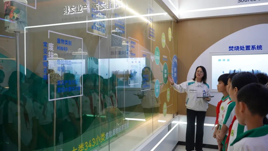 在環(huán)??破照箯d,小朋友們宛如開(kāi)啟了一場(chǎng)奇妙的環(huán)保探索之旅,在老師生動(dòng)細(xì)致的講解和深入淺出的引導(dǎo)下,孩子們通過(guò)沙盤(pán)模型,工藝視頻等了解了處置中心的布局和主要的危廢處置工藝;理解了什么是“碳中和”,通過(guò)哪些方式可以控制我們的碳排放,逐漸達(dá)到“碳中和”;也記住了危險(xiǎn)廢物有哪些特性,常見(jiàn)的危險(xiǎn)廢物有哪些,危險(xiǎn)廢物在焚燒爐中的溫度可以達(dá)到1100℃以上等。在老師的提問(wèn)和小朋友積極的互動(dòng)中,感嘆小朋友的見(jiàn)識(shí)和平時(shí)積累的環(huán)保知識(shí)也挺豐富呢!