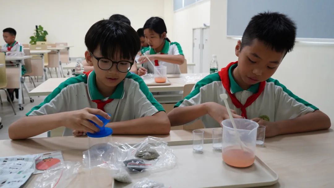 在環(huán)保科普課堂,老師詳細(xì)講解了我們地球的組成,是三分陸地和七分海洋,水是生命之源;我們國(guó)家的水資源集中分布在東南部,淡水資源是很珍貴的;我們?nèi)祟悓?duì)樹(shù)木的過(guò)度砍伐,對(duì)礦產(chǎn)的過(guò)度開(kāi)采,以及過(guò)度放牧等行為都對(duì)水環(huán)境帶來(lái)了諸多問(wèn)題,造成水體流失、水體污染等,給我們?nèi)祟惖纳嬖斐刹焕绊?。小朋友們?tīng)得津津有味,體會(huì)到愛(ài)護(hù)環(huán)境,保護(hù)水資源的重要性。最后,老師以自來(lái)水廠凈水過(guò)程為切入點(diǎn),帶領(lǐng)大家動(dòng)手實(shí)踐,開(kāi)展一個(gè)凈水操作的小實(shí)驗(yàn),通過(guò)組裝花崗巖石子、瓷砂、活性炭、石英砂、過(guò)濾棉和濾紙等,制作簡(jiǎn)易凈水器,把準(zhǔn)備好的泥水倒入凈水器,讓泥水層層通過(guò)過(guò)濾層,小朋友們饒有興趣地仔細(xì)觀察泥水前后顏色、性狀的變化,體會(huì)污水凈化的原理,在小小的內(nèi)心里升騰起對(duì)環(huán)保科技的熱愛(ài)。