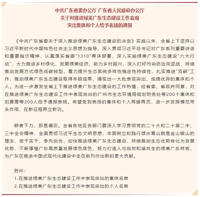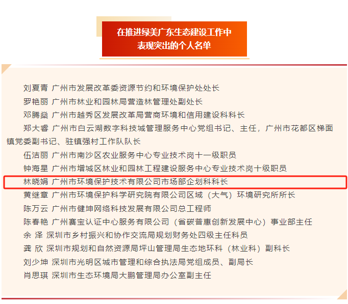 近日,中共廣東省委辦公廳、廣東省人民政府辦公廳對(duì)在推進(jìn)綠美廣東生態(tài)建設(shè)工作中表現(xiàn)突出的200個(gè)集體和200人給予通報(bào)表?yè)P(yáng),我司市場(chǎng)部企劃科科長(zhǎng)林曉娟榮獲“推進(jìn)綠美廣東生態(tài)建設(shè)工作表現(xiàn)突出個(gè)人”榮譽(yù)稱號(hào)。這一殊榮不僅是對(duì)林曉娟個(gè)人專業(yè)能力和辛勤付出的高度認(rèn)可,更是對(duì)環(huán)保技術(shù)公司在綠美廣東建設(shè)領(lǐng)域深耕不輟,助力打好污染防治攻堅(jiān)戰(zhàn)的充分肯定。